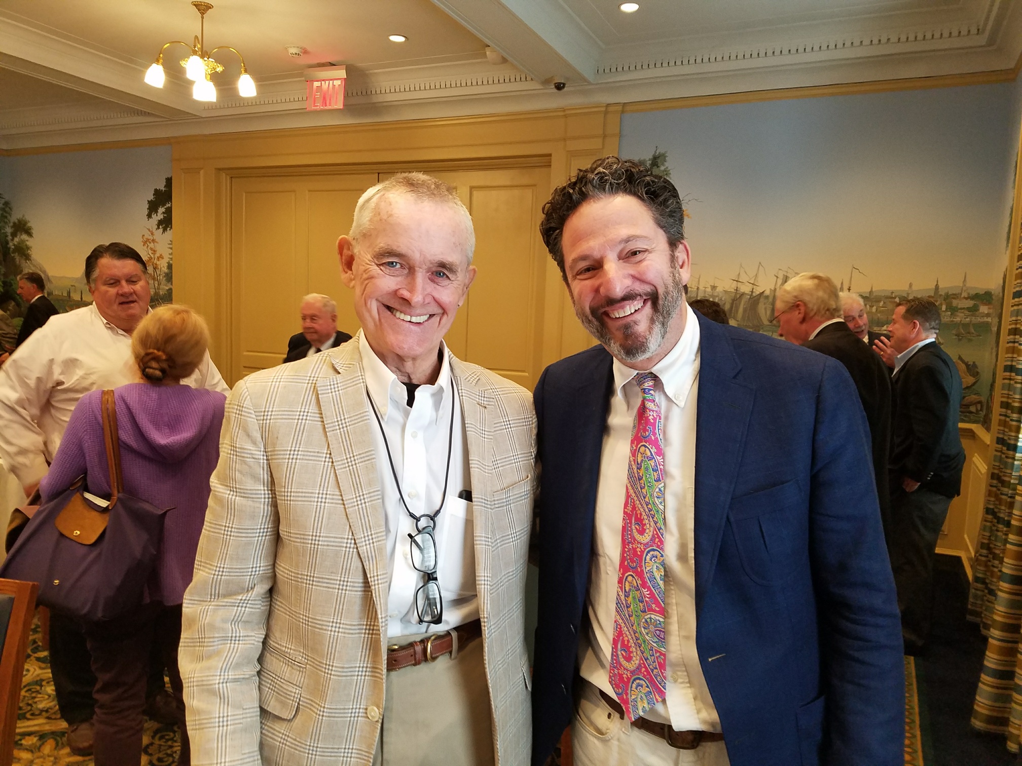 In the conversation, Jim recalls his first Red Sox game in 1946 which entailed flying with his brother as a twelve year old from Newark to Boston at a cost of $12.50 (he still has the receipt) and watching Ted Williams and Mel Parnel in what was, right until it wasn't, a magical season for the Sox. He also recounts the fun had by himself and clients at early BLOHARD lunches, his friendship with Harry Frazee's widow, and his attendance at the Bucky Dent game. Jim's interview, digitally preserved for all time, is available for viewing on our website. He is pictured above with John Pizzarelli. The Pizz Watch New Album Drops July 28 BLOHARDS' official crooner John Pizzarelli is releasing a new album on July 28th - Sinatra & Jobim @ 50 (Concord Jazz). The record which was made in collaboration with Daniel Jobim, the grandson of famed bossa nova composer Antonio Carlos Jobim, commemorates the fiftieth anniversary of the release of Francis Albert Sinatra & Antônio Carlos Jobim, an effort which lost the 1967 Grammy for Album of the Year to Sgt. Pepper's Lonely Hearts Club Band. John and Daniel's tribute has garnered attention on Billboard, among other places, and is available in hard and downloaded form on Amazon. The two will be appearing with a full band at Birdland in New York City during the week of August 8 to support the new record. At lunch John encouraged attendees to "buy in bulk", noting that the recent matriculation of his daughter to college has given him "sixty-eight thousand reasons to hope this record sells big." |
