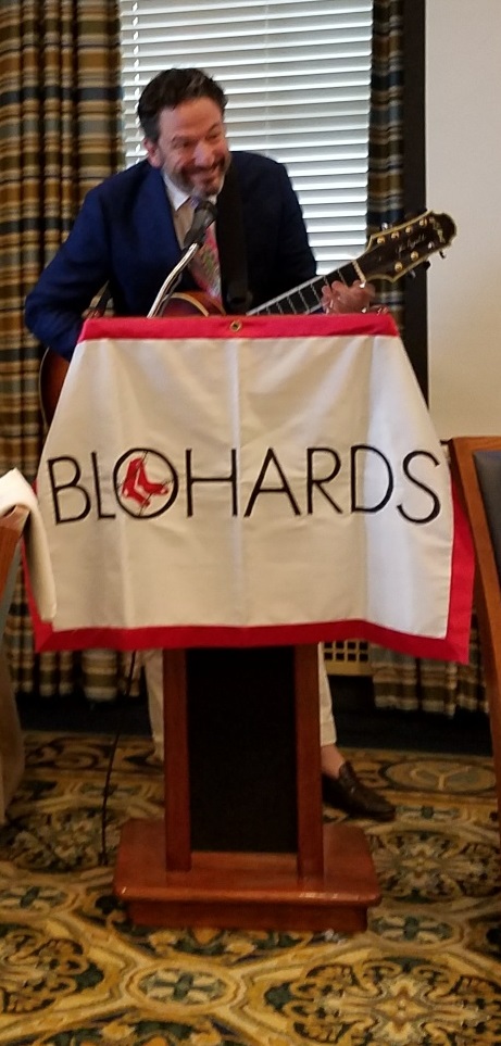 Official BLOHARD Troubadour John Pizzarelli and Emcee Joe Cosgriff had to sing and preside respectively for suppers which, in keeping with tradition, they didn't actually receive. This seemed to affect neither Pizzarelli's mood, which was excellent, nor his singing which was virtuosic. Pizz introduced two new offerings, both of which immediately became part of the Great American Songbook. A couple of verses from the first, "Love Chris Sale" to melody of Cole Porter's "Love for Sale" follow: Love Chris Sale. You just can't help but love Chris Sale. Make sure all those whiffs are marked, He pitches like he's double-parked. Love Chris Sale… So far there's a lot to love. Sale's a guy you've got to love. Goodbye, Hello, Got some tips for Rick Porcello?... Love Chris Sale. I really, really love Chris Sale. With some help from David Price, We ride this guy to paradise Love Chris Sale. "Mookie Betts" to the tune, of course, of "Meet the Mets" is shown in its entirety below: Mookie Betts, Mookie Betts. Makes me want to call my bookie And make kooky bets. Love my kiddies, love my wife. But Mookie is the reason I go on with my life. Cause Mookie Betts is really Rocking the Wall. And if it's south of the Mass Pike, He catches the ball. So North End, Southie, Grab a ticket, c'mon down. To see B-E-T-T-T-S, Betts. In our hometown |