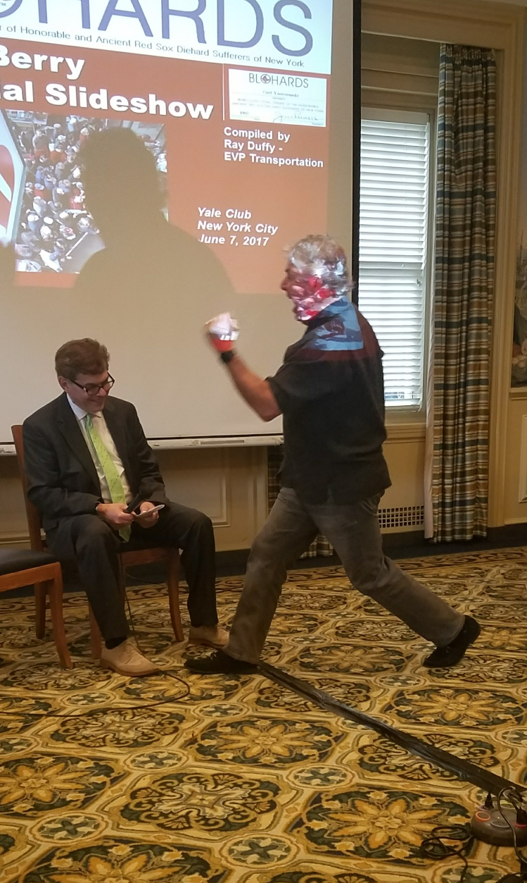 Slide Show Features Slides, Show The Henry Berry Slide Show was replete with hilarity, only some of which derived from narrator Ray Duffy's pronunciations. Amongst the highlights: Notwithstanding some recent chilly-and-precipitate weather, Ray had Grounds Crew Chief Dave Mellor sanguine about the playability of Fenway by the time of the Sox's return; A defense of Mr. Met predicated on the absence of a middle finger on hands with an even number of digits; A recap of the opening day trip which chronicled the misadventures of Bus #2; deciphered its indecipherable glyph; and noted that while we all heard the pregame stealth bomber flyover, we didn't actually see it, owing to the awning and, well… because those planes are stealthy. Observations on players included note of Chris Sale's impeccable control, "at least when Manny Machado isn't batting", the irony of Pablo Sandoval's puny offensive contribution being, in Ray's words "plenty offensive" and the observation that Sale's exemplary work pace had inspired even Eduardo Rodriguez to pitch "like he had somewhere to be tomorrow". The show wrapped up with Senator's pitcher Don Lee asking why he was included in a BLOHARD slide show. The answer, it turns out, is that in giving up Ted Williams' 517th home run in September of 1960, Lee became the only son to allow a homer to a player who also homered off his father, in this case Thornton "Thorny" Lee, who was touched up by the Splinter in September 1939. Now you know. Other Stuff Happens...